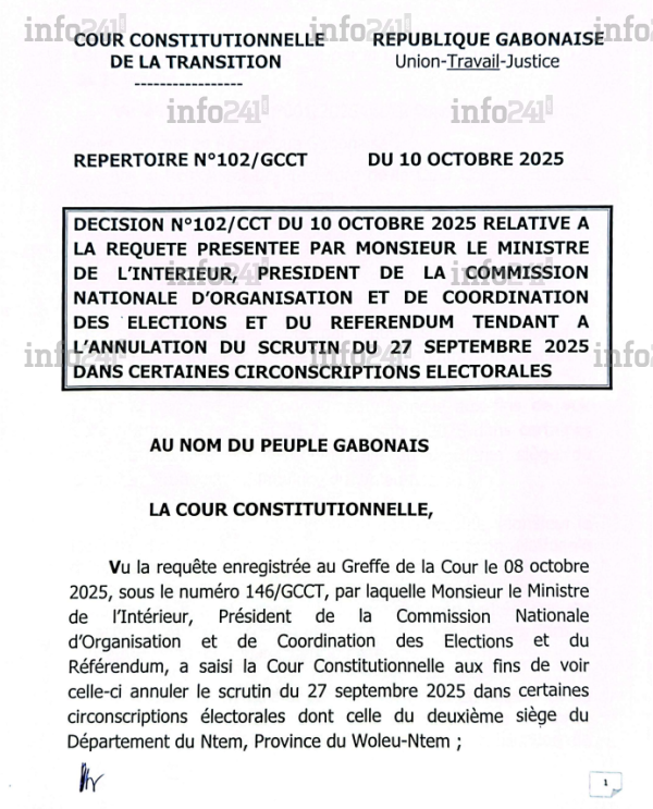Coup de théâtre pour les électeurs de Bitam et du canton Mvézé (Woleu-Ntem, nord du Gabon). La Cour constitutionnelle a ordonné, dans sa décision n°102/CCT rendue ce vendredi 10 octobre, la suspension des opérations électorales au 2ᵉ siège du département du Ntem à la suite d’un recours introduit le 8 octobre par le ministre de l’Intérieur et président de la CNOCER, Hermann Immongault. Cette décision intervient à la veille du second tour des législatives prévu ce samedi qui devait opposer un candidat UDB à l’UN.