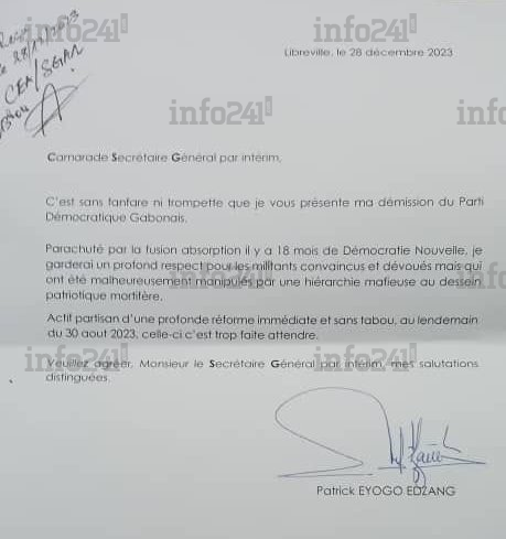 Le Parti démocratique gabonais (PDG) d’Ali Bongo chassé du pouvoir l’armée gabonaise vit ses heures les plus troubles. La faillite politique de l’ancien parti unique se confirme de plus en plus avec les démissions en cascade de ses anciens militants. Ce jeudi 28 décembre le tour est revenu à l’ancien ministre de l’Energie, Patrick Karim Eyogo Edzang, par ailleurs secrétaire général adjoint 5 chargé des relations avec les partenaires politiques.