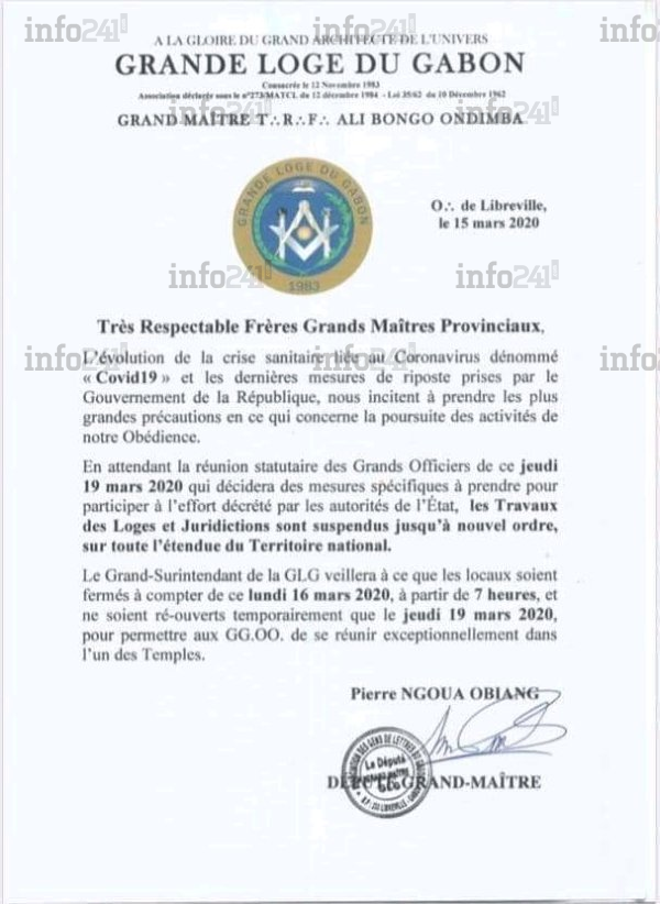 Coronavirus : la Grande loge du Gabon annonce la fermeture de ses temples maçonniques © 2020 D.R./Info241