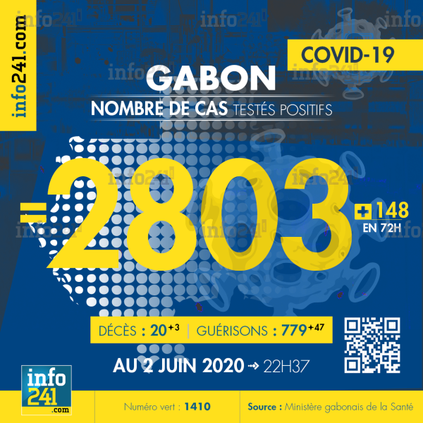 Le bilan de l’épidémie de coronavirus au Gabon au 2 juin : 148 nouveaux cas enregistrés en 72h dans l’Estuaire (145 cas) et le Moyen-Ogooué (3 cas). Il y a eu 3 nouveaux décès et 57 nouvelles guérisons. Ce qui porte le bilan à 2 803 cas confirmés, 20 décès et 779 guérisons. Il y a actuellement 96(+13) patients hospitalisés dans le pays dont 12 (-1) en réanimation.