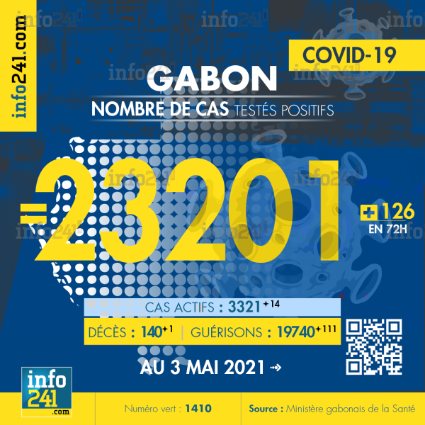 Ce qui porte le bilan à 23 201 cas confirmés, 140 décès et 19 740 guérisons. Le Gabon compte actuellement 3 321(+14) cas actifs de la pandémie officiellement déclarés. Parmi eux 55(+4) patients hospitalisés dans le pays dont 22(+3) en réanimation.