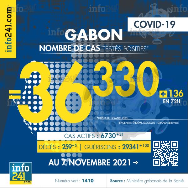 Bilan épidémiologique du Gabon au 7 novembre 2021 : 136 nouveaux cas enregistrés en 72h dans l’Estuaire (118 cas), l’Ogooué-Maritime (15 cas), la Ngounié (1 cas) l’Ogooué-Ivindo (1 cas) et l’Ogooué-Lolo (1 cas). Il y a eu 5 nouveaux décès et 100 nouvelles guérisons.