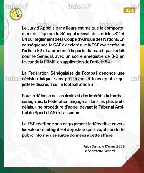 La riposte institutionnelle sénégalaise s’est matérialisée dès ce mardi 17 mars. Depuis Dakar, la Fédération sénégalaise de football (FSF) a publié un communiqué officiel accusant réception de la notification de cette décision rendue par le jury d’appel de la CAF. Ce document intervient dans le cadre de l’affaire enregistrée sous le numéro DC23316, faisant suite à la plainte formulée lors du match n° 52 de la compétition.