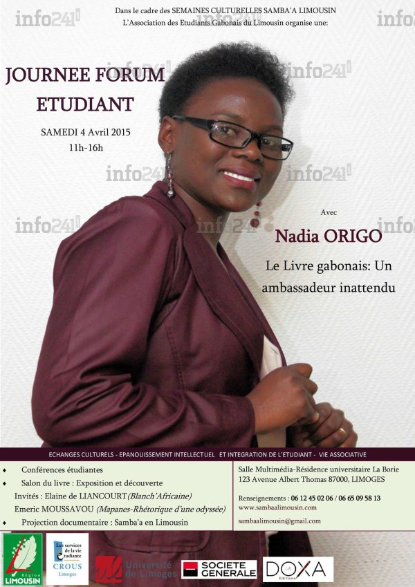 L’écrivaine gabonaise, directrice de La Doxa Editions, Nadia Origo animera ce samedi à Limoges une conférence intitulée « Le Livre Gabonais : un ambassadeur inattendu ». Ceci, dans le cadre des « Semaines culturelles » organisées par l’Association des étudiants Gabonais du Limousin (Samba’a Limousin) en partenariat avec l’Université de Limoges, la région du Limousin et le Crous de Limoges.