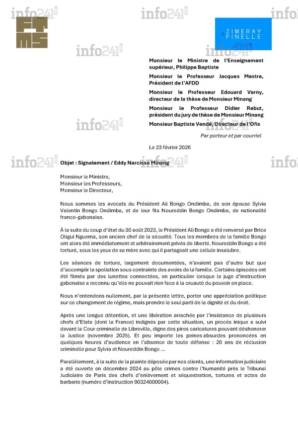 Dans leur requête envoyée en masse à ces 6 personnalités, les conseils de Sylvia et Noureddin Bongo Ondimba présentent le magistrat comme l’ « ordonnateur » d’un « simulacre de procès » et d’une « cruelle parodie de justice » . Ils évoquent « enlèvement » , « séquestration » , « tortures et actes de barbarie » , puis un « procès inique » . Le ton est grave, presque théâtral. Mais il ne répond pas à la question centrale : quel lien juridique existe-t-il entre ces accusations et la validité d’un doctorat soutenu en juillet 2023 ?