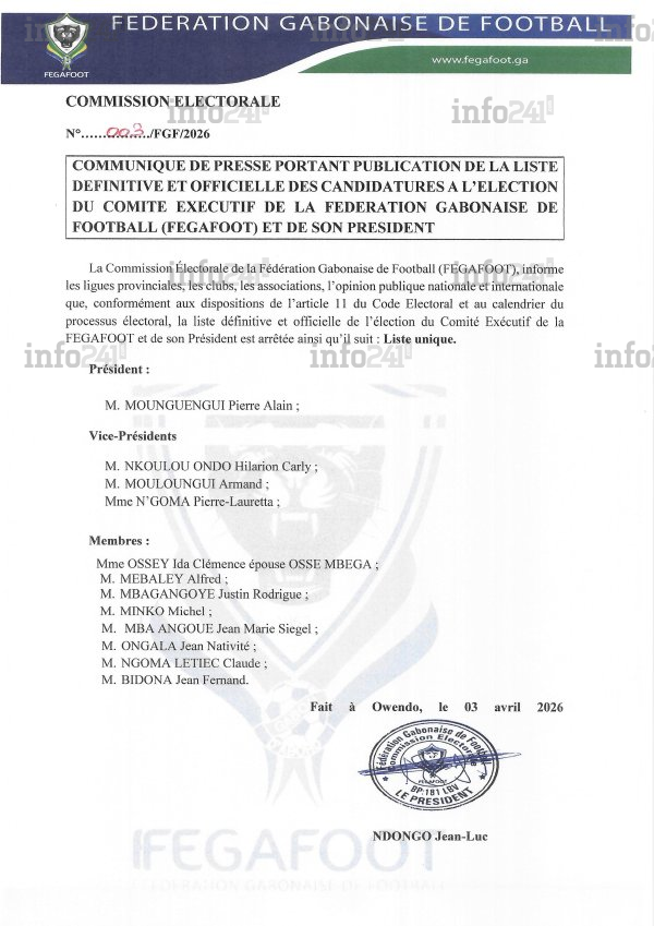 Le processus s’est décanté en deux temps. D’abord, le vendredi 27 mars 2026, la commission électorale de la Fégafoot a rendu publics, lors d’un point de presse tenu à son siège d’Owendo, les résultats provisoires de l’examen des quatre dossiers de candidature déposés pour la présidence. Ensuite, après l’expiration de la phase de recours, elle a publié, le 3 avril, le communiqué n° 003/FGF/2026 portant publication de la liste définitive et officielle, arrêtée à une seule candidature. Ce communiqué précise que cette décision est prise conformément à l’article 11 du Code électoral et au calendrier du processus électoral.