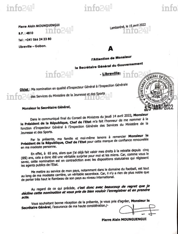 Le lettre de refus de sa nomination, un pied de nez à Ali Bongo et à Franck Nguema