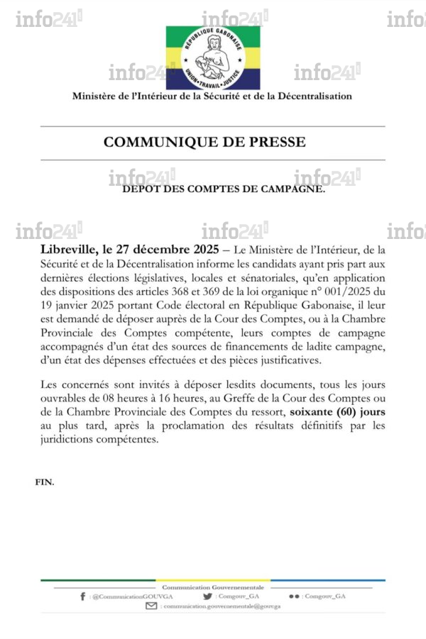 Les différents candidats aux trois grandes élections organisées au Gabon, du 27 septembre au 6 décembre, ont encore une obligation légale à remplir. Élus ou non, ils sont tenus de présenter leurs comptes de campagne. Un rappel a de nouveau été adressé ce samedi par le gouvernement, à travers le ministère de l’Intérieur, qui souligne le caractère obligatoire de cette démarche, inscrite dans le nouveau Code électoral adopté en janvier 2025.