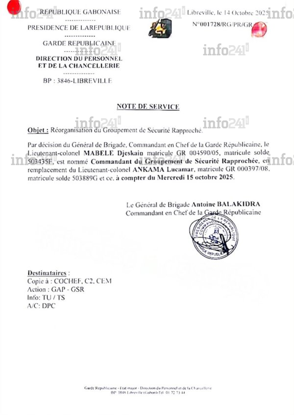 Coup de tonnerre au sein de la Garde républicaine (GR) en charge de la protection du président gabonais Brice Clotaire Oligui Nguema. L’unité d’élite a procédé, ce mardi 14 octobre à la révocation du lieutenant-colonel Lucamar Ankama alias "Power", commandant du Groupement de sécurité rapprochée (GSR) de la GR et neveu du président. Selon une note de service officielle n°001728/RG/PR/GR authentifiée par l’AGP, cette décision serait motivée par de « graves manquements à la discipline militaire ». Le poste stratégique laissé vacant a été immédiatement confié au lieutenant-colonel Mabele Djeskain, nouvellement nommé à la tête du GSR.