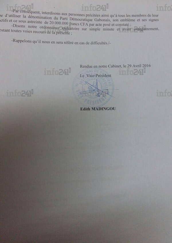 Selon l’ordonnance du tribunal signée de la vice-présidente du tribunal de première instance de Libreville, Edith Madingou, interdiction a été faite à Hugues Alexandre Barro Chambrier, Michel Menga M’Essone et Jonathan Ingnoumba ainsi qu’à tous les membres de leur équipe « d’utiliser la dénomination du Parti démocratique gabonais, son emblème et ses signes distinctifs ».