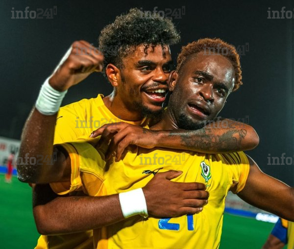 Le joueur célébrant avec ses pairs le 2e but gabonais de la rencontre