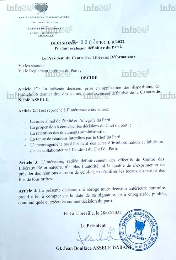 En effet, le lundi 28 février, Jean Boniface Assélé, fondateur du CLR, au travers d’un courrier n⁰003/PF/CLR/2022 portant exclusion définitive du parti, a évincé sa fille Nicole. En son article 1, la présente décision prise en application des dispositions de l’article 36 dernier tiret des statuts, porte exclusion définitive de la camarade Nicole Assélé.