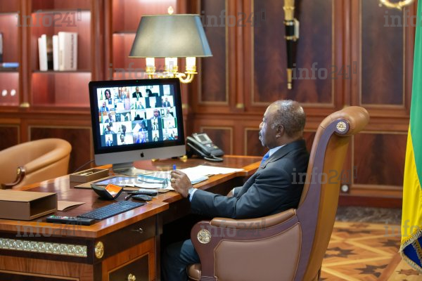 Ali Bongo dirigeant par visioconférence le conseil des ministres du 9 avril dernier