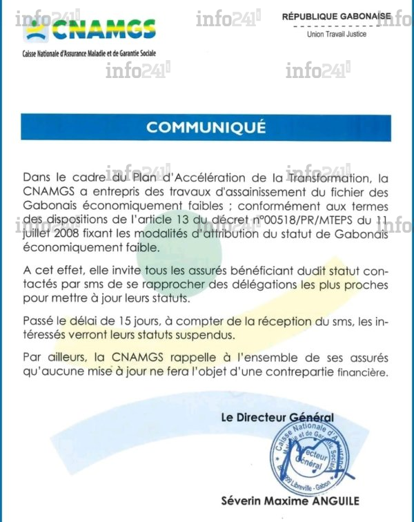 « Dans le cadre du Plan d’accélération de la transformation, la CNAMGS a entrepris des travaux d’assainissement du fichier des Gabonais économiquement faibles », prévient d’entrée la caisse publique de couverture santé. Avant d’inviter « tous les assurés bénéficiant dudit statut contactés par sms de se rapprocher des délégations les plus proches pour mettre à jour leurs statuts ».