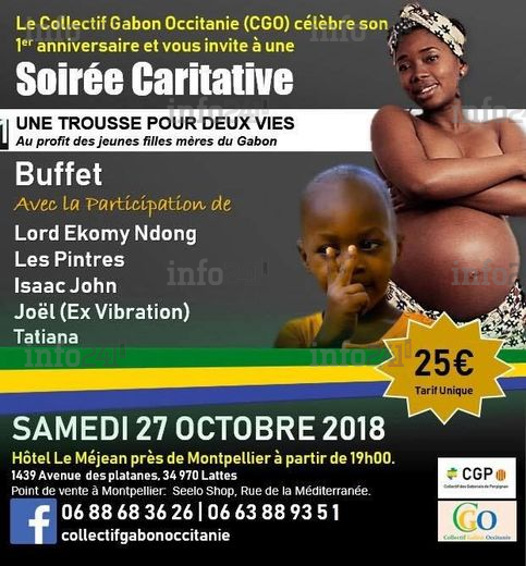 Dans un communiqué de presse parvenu à la rédaction d’Info241, le collectif Objectif Gabon Occitanie informe à toute la communauté gabonaise, africaine qu’il organisera le samedi 27 octobre 2018 une grande soirée pour aider les futures mamans du Gabon, des femmes en situation précaire, pour raviver la résistance contre le régime qualifié de dictatorial d’Ali Bongo pour célébrer sa première année d’existence.