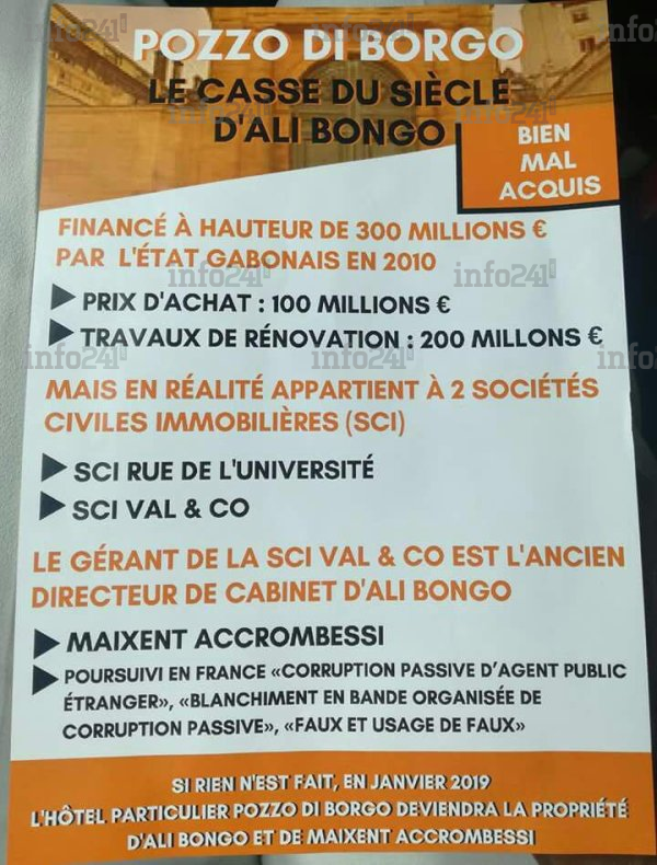 Avant leur marche, plusieurs d’entre eux ont tenu dans la matinée à observer un rassemblement devant l’hôtel parisien Pozzo di Borgo, acquis par l’Etat gabonais en 2010 et qui depuis est toujours en réfection. Cet hôtel considéré comme le « casse du siècle d’Ali Bongo », serait une acquisition détournée. Un savant montage financier au sommet duquel trônerait les intérêts privés d’Ali Bongo et de son ami Maixent Accrombessi, déjà poursuivi en France pour de nombreuses affaires de corruption.
