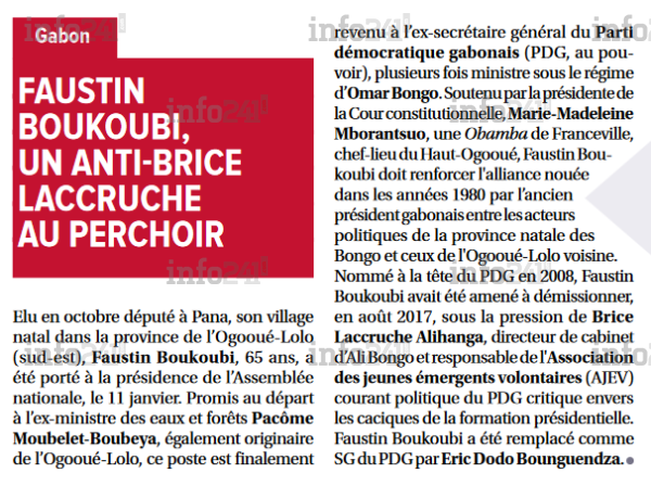 Selon nos confrères très aux faits des confidences de pouvoir, Marie Madeleine Mborantsuo aurait soutenu à cette élection qui a eu lieu le 11 janvier, Faustin Boukoubi. Ce, afin que par cette nomination Faustin Boukoubi « renforce l’alliance nouée dans les années 1980 par l’ancien président gabonais (Omar Bongo, ndlr) entre les acteurs politiques de la province natale des Bongo (Haut-Ogoouée dont est originaire Mborantsuo) et ceux de l’Ogooué-Lolo voisine ».