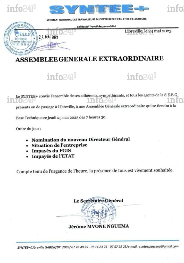Dans son appel à une assemblée générale extraordinaire ce jeudi matin, le syndicat des agents entend ratisser large en rassemblant l’ensemble des employés. « Le SYNTEE+ convie l’ensemble de ses adhérents, sympathisants et tous les agents de la S.E.E.G présents ou de passage à Libreville, à une Assemblée Générale extraordinaire qui se tiendra à la Base Technique ce jeudi 25 mai 2023 dès 7 heures 30 », indique la note parvenue ce mercredi à la rédaction d’Info241.