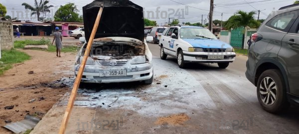 Port-Gentil : Un taxi prend feu en pleine circulation obligeant ses occupants à la fuite ! © 2026 D.R./Info241