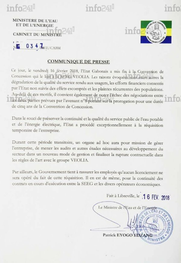 « Ce jour, le vendredi 16 février 2018, l’Etat gabonais a mis fin à la convention qui le liait à la SEEG-VEOLIA. Les raisons évoquées sont entre autres, la dégradation de qualité de service rendu aux usagers, les efforts financiers consentis par l’Etat non suivis des effets escomptés et les plaintes récurrentes des populations. Il convient également de noter l’échec des négociations entre les deux parties prévues par l’avenant numéro 8 portant sur la prorogation pour une durée de cinq ans de la convention de concession », indique le communiqué signé du ministre de l’Eau et de l’Energie, Patrick Eyogho Edzang.