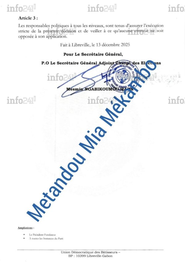 La décision comporte trois articles particulièrement explicites. Le premier suspend Fiacre Mpako Ngoma « à titre conservatoire de toute activité au sein ou pour le compte du parti ». Le deuxième précise que la mesure demeure valable jusqu’à ce que le conseil de discipline se prononce « définitivement sur les manquements reprochés ». Le troisième enjoint tous les responsables politiques de l’UDB, « à tous les niveaux », d’assurer l’exécution stricte de cette décision et de veiller à ce qu’« aucune entrave ne soit opposée à son application ». Le document est adressé en ampliation au président fondateur du parti et à l’ensemble de ses instances.