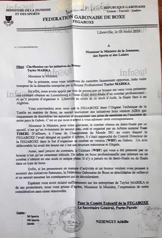 Taylor Mabika dénonce ainsi la campagne de dénigrement fomentée contre lui par la Fédération gabonaise qui ferait une "interprétation" erronée du règlement de l’AIBA en plus de diffamer plusieurs acteurs reconnus du monde de la boxe professionnelle. Au ministre de tutelle désormais de trancher !