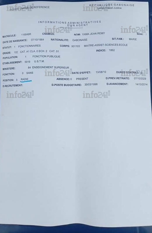 Un leader syndical radié sans sommation de la Fonction publique par les autorités gabonaises © 2022 D.R./Info241