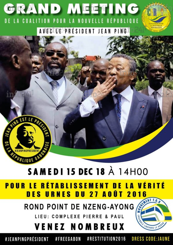 Après avoir mené plusieurs consultations suite à son appel au rassemblement « en vue de conduire le Gabon vers la nouvelle destinée », Jean Ping et la CNR animeront un important grand meeting ce samedi au quartier de Nzeng-Ayong. Craignant certainement une interdiction des autorités, ce meeting aura lieu dans un lieu privé au complexe Pierre et Paul situé près du rond-point de Nzeng-Ayong.