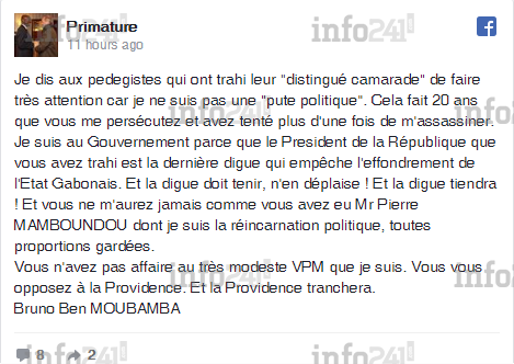 L’opposant "réformateur" s’est voulu tout de même précis dans cet énième coup de gueule : « Je dis aux pedegistes qui ont trahi leur "distingué camarade" de faire très attention car je ne suis pas une "pute politique" ». Le vice premier ministre gabonais d’expliquer sa présence au gouvernement en ces termes : « Je suis au Gouvernement parce que le Président de la République que vous avez trahi est la dernière digue qui empêche l’effondrement de l’Etat Gabonais ».