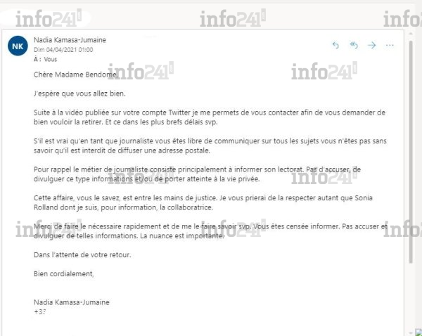 Anne Marie Dworaczek Bendome, journaliste gabonaise en France, a reçu un mail particulièrement directif de Nadia Kamasa Jumaine, qui s’est présentée comme « la collaboratrice de Sonia Rolland », ex Miss France 2000. Ce qui a fortement déplu à la collaboratrice, c’est la publication sur le compte twitter de la journaliste d’une vidéo d’activistes gabonais expliquant en quoi l’appartement offert par Omar Bongo à Sonia Rolland en 2003 est un bien mal acquis et présentant mieux ledit appartement (photos, nombres de pièces, adresse, SCI...).
