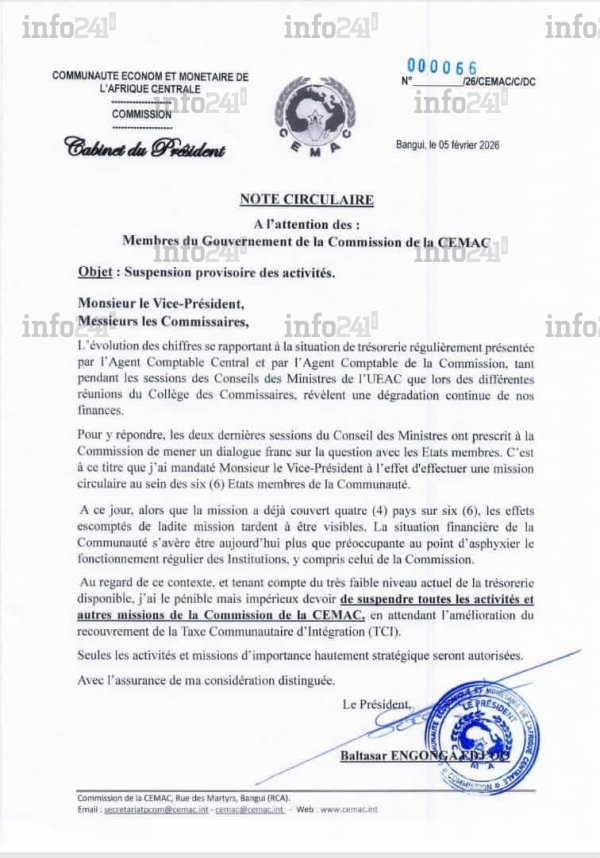 En conséquence, le président annonce une mesure radicale. « Compte tenu du très faible niveau actuel de la trésorerie disponible, j’ai le pénible mais impérieux devoir de suspendre toutes les activités et autres missions de la Commission de la CEMAC, en attendant l’amélioration du recouvrement de la Taxe communautaire d’intégration (TCI) », précise la note. Le document ajoute que « seules les activités et missions d’importance hautement stratégique seront autorisées ».