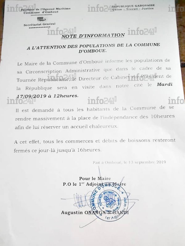 Selon une note d’information datée du vendredi 13 septembre et signée du premier adjoint au maire, Augustin Onanga N’gandi, rien n’est trop beau pour réserver un accueil chaleureux à Brice Fargeon. « Il est demandé à tous les habitants de la commune de se rendre massivement à la place de l’indépendance dès 10 heures », réclame la mairie d’Omboué à ses habitants. Car précise la note, il s’agirait d’une « tournée républicaine » du collaborateur d’Ali Bongo dans cette localité.