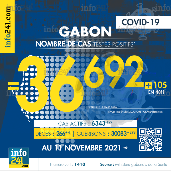 Bilan épidémiologique du Gabon au 11 novembre 2021 : 105 nouveaux cas enregistrés en 48h dans l’Estuaire (67 cas), l’Ogooué-Maritime (28 cas), l’Ogooué-Ivindo (4 cas), l’Ogooué-Lolo (4 cas) et la Ngounié (2 cas). Il y a eu 4 nouveaux décès et 298 nouvelles guérisons.