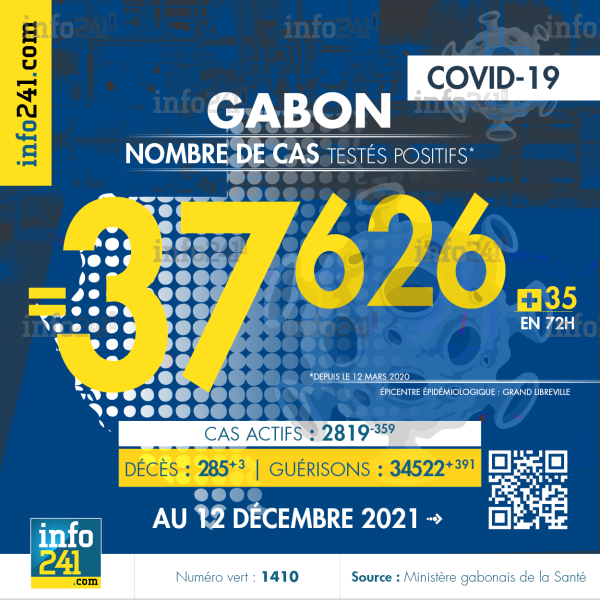 Bilan épidémiologique du Gabon au 12 décembre 2021 : 35 nouveaux cas enregistrés en 48h dans l’Estuaire (30 cas), l’Ogooué-Ivindo (2 cas), l’Ogooué-Maritime (2 cas) et le Haut-Ogooué (1 cas). Il y a eu 3 nouveaux décès et 391 nouvelles guérisons.
