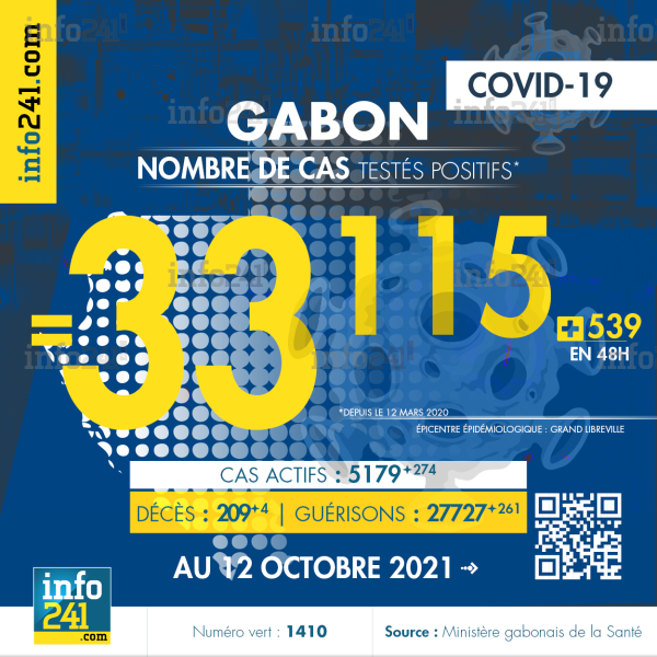 Bilan épidémiologique du Gabon au 12 octobre 2021 : 539 nouveaux cas enregistrés en 48h dans l’Estuaire (358 cas), l’Ogooué-Maritime (152 cas), le Haut-Ogooué (9 cas), le Moyen-Ogooué (7 cas), le Woleu-Ntem (6 cas), l’Ogooué-Ivindo (3 cas), l’Ogooué-Lolo (3 cas) et la Nyanga (1 cas). Il y a eu 4 nouveaux décès et 261 nouvelles guérisons.