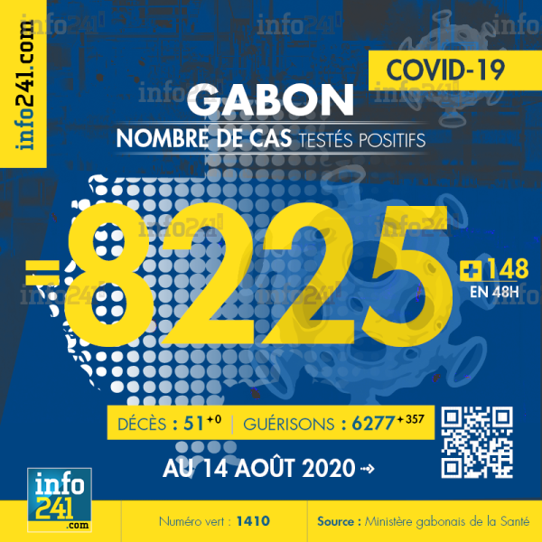 Ce qui porte le bilan à 8 225 cas confirmés, 51 décès et 6 277 guérisons. Le Gabon compte actuellement 2 106 cas actifs de la pandémie officiellement déclarés. Parmi eux 29(-0) patients hospitalisés dans le pays dont 1(+1) en réanimation.
