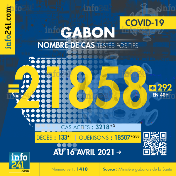 Ce qui porte le bilan à 21 858 cas confirmés, 133 décès et 18 507 guérisons. Le Gabon compte actuellement 3 218(+3) cas actifs de la pandémie officiellement déclarés. Parmi eux 77(+7) patients hospitalisés dans le pays dont 19(-1) en réanimation.