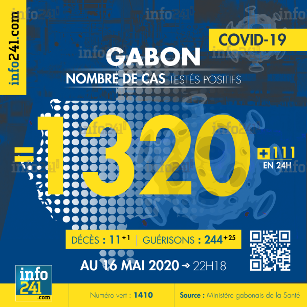 Le bilan de l’épidémie de coronavirus au Gabon au 16 mai : 111 nouveaux cas enregistrés en 24h, un nouveau décès à Libreville et 25 nouvelles guérisons. Ce qui porte le bilan à 1320 cas confirmés, 11 décès et 244 guérisons.