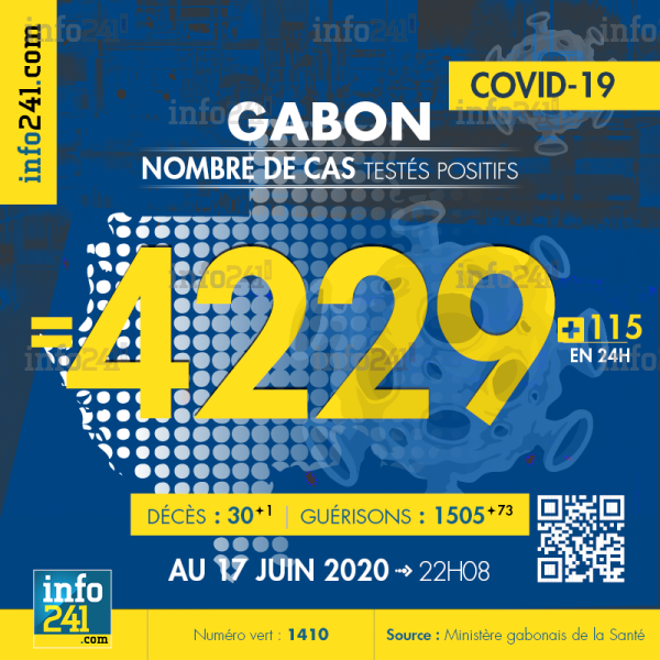 Le bilan épidémiologique du Gabon au 17 juin 2020 : 115 nouveaux cas enregistrés en 24h dans l’Estuaire (95 cas), le Haut-Ogooué (12 cas), la Ngounié (5 cas) et l’Ogooué-Ivindo (3 cas). Il y a eu 1 nouveau décès et 73 nouvelles guérisons. Ce qui porte le bilan à 4 229 cas confirmés, 30 décès et 1 505 guérisons. Il y a actuellement 102(-5) patients hospitalisés dans le pays dont 16 (+1) en réanimation.