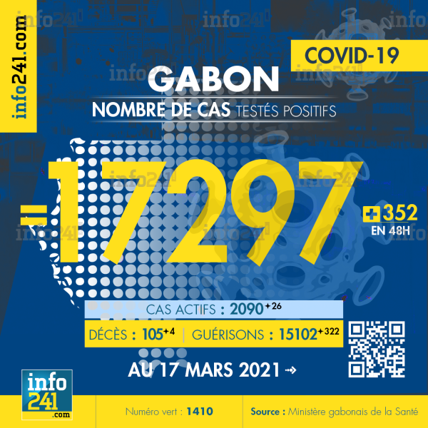 Ce qui porte le bilan à 17 297 cas confirmés, 105 décès et 15 102 guérisons. Le Gabon compte actuellement 2 090 (+26) cas actifs de la pandémie officiellement déclarés. Parmi eux 95(+5) patients hospitalisés dans le pays dont 19(-8) en réanimation.