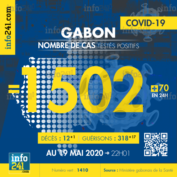 Le bilan de l’épidémie de coronavirus au Gabon au 19 mai : 70 nouveaux cas enregistrés en 24h dans l’Estuaire (45), le Haut-Ogooué (20), Moyen-Ogooué (2) et l’Ogooué-Lolo (3). Il y a eu un nouveau décès à Libreville et 17 nouvelles guérisons. Ce qui porte le bilan à 1 502 cas confirmés, 12 décès et 318 guérisons.