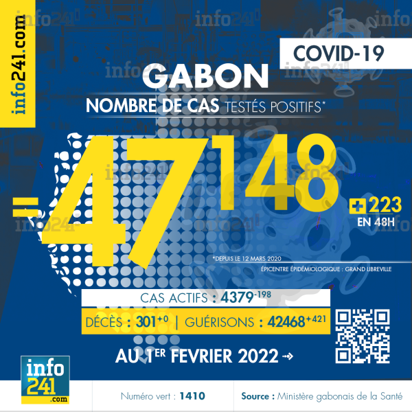 Bilan épidémiologique du Gabon au 1er février 2022 : 223 nouveaux cas enregistrés en 48h dans l’Ogooué-Maritime (189 cas) et l’Estuaire (34 cas) . Il y a eu aucun nouveau décès et 421 nouvelles guérisons.