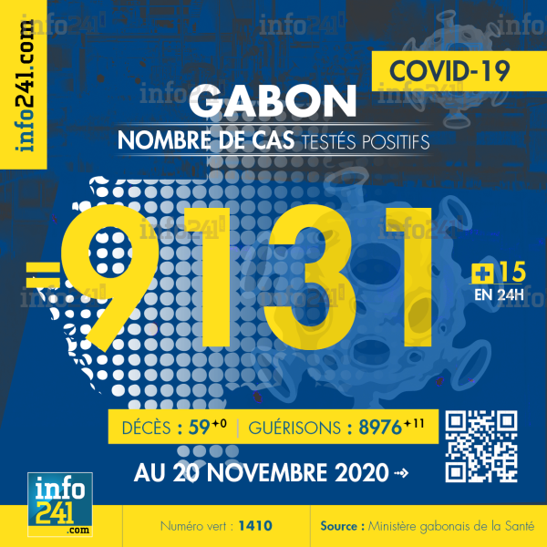 Ce qui porte le bilan à 9 131 cas confirmés, 59 décès et 8 976 guérisons. Le Gabon compte actuellement 96(+4) cas actifs de la pandémie officiellement déclarés. Parmi eux 4(-1) patients hospitalisés dans le pays dont 3(-2) en réanimation.