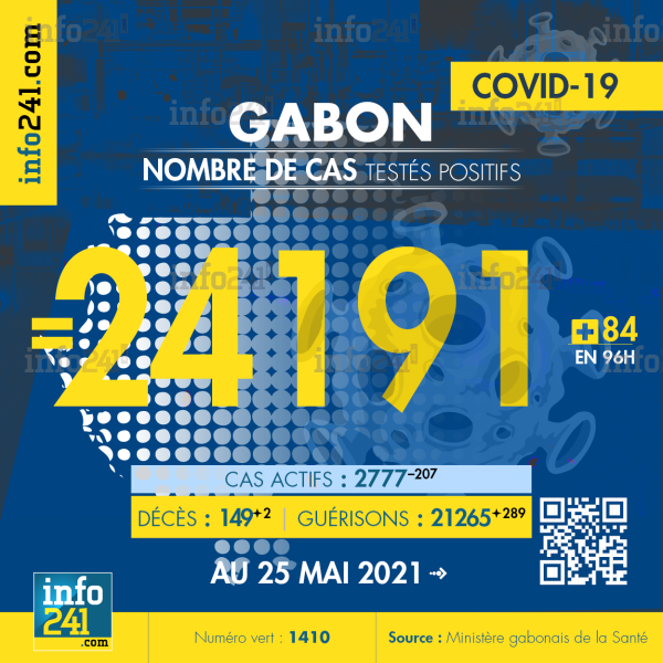 Ce qui porte le bilan à 24 191 cas confirmés, 149 décès et 21 265 guérisons. Le Gabon compte actuellement 2 777(-207) cas actifs de la pandémie officiellement déclarés. Parmi eux 46(-1) patients hospitalisés dans le pays dont 22(-1) en réanimation.