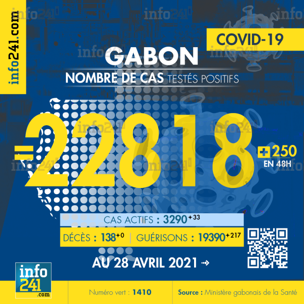Ce qui porte le bilan à 22 818 cas confirmés, 138 décès et 19 390 guérisons. Le Gabon compte actuellement 3 290(+33) cas actifs de la pandémie officiellement déclarés. Parmi eux 61(-8) patients hospitalisés dans le pays dont 21(+2) en réanimation.