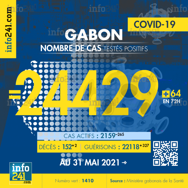 Ce qui porte le bilan à 24 429 cas confirmés, 152 décès et 22 118 guérisons. Le Gabon compte actuellement 2 159(-265) cas actifs de la pandémie officiellement déclarés. Parmi eux 46(+5) patients hospitalisés dans le pays dont 20(+3) en réanimation.