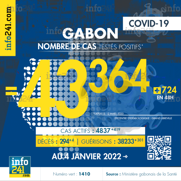 Ce qui porte le bilan à 43 364 cas confirmés, 294 décès et 38 233 guérisons. Le Gabon compte actuellement 4 837 (+419) cas actifs de la pandémie officiellement déclarés. Parmi eux 46 (+2) patients hospitalisés dans le pays dont 14 (+2) en réanimation.