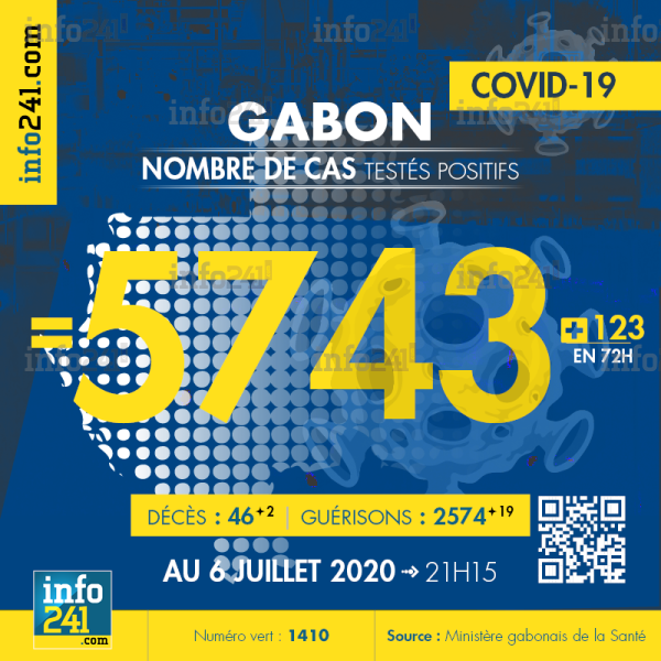Bilan épidémiologique du Gabon au 6 juillet 2020 : 123 nouveaux cas enregistrés en72h dans l’Estuaire (77 cas), le Haut-Ogooué (22 cas), la Ngounié (10 cas), la Nyanga (7 cas), l’Ogooué-maritime (5 cas) et le Moyen-Ogooué (2 cas). Il y a eu deux nouveaux décès et 19 nouvelles guérisons. Ce qui porte le bilan à 5 743 cas confirmés, 46 décès et 2 574 guérisons. Il y a actuellement 3 123 cas actifs. Parmi eux 47(-8) patients hospitalisés dans le pays dont 11(+1) en réanimation.