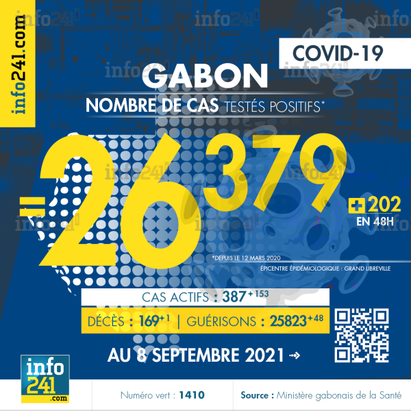 Ce qui porte le bilan à 26 379 cas confirmés, 169 décès et 25 823 guérisons. Le Gabon compte actuellement 287 (+153) cas actifs de la pandémie officiellement déclarés. Parmi eux 48 (+5) patients hospitalisés dans le pays dont 16 (+1) en réanimation.