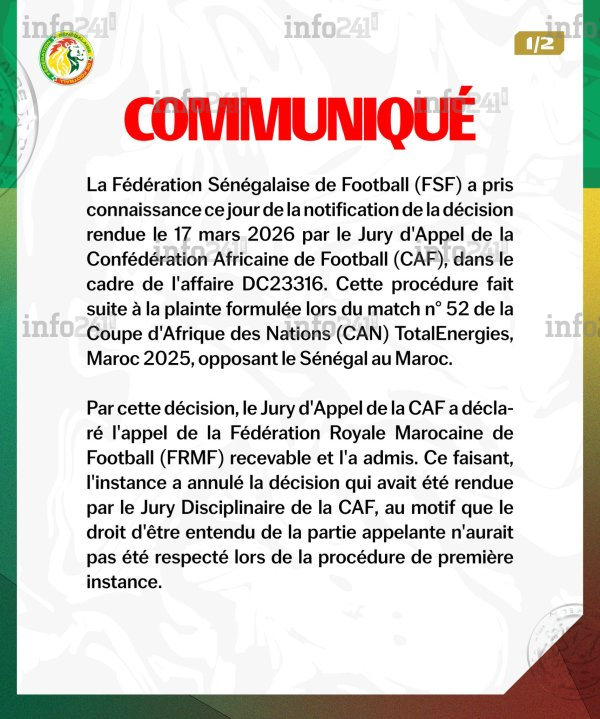 La riposte institutionnelle sénégalaise s’est matérialisée dès ce mardi 17 mars. Depuis Dakar, la Fédération sénégalaise de football (FSF) a publié un communiqué officiel accusant réception de la notification de cette décision rendue par le jury d’appel de la CAF. Ce document intervient dans le cadre de l’affaire enregistrée sous le numéro DC23316, faisant suite à la plainte formulée lors du match n° 52 de la compétition.